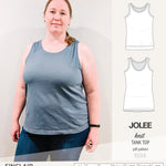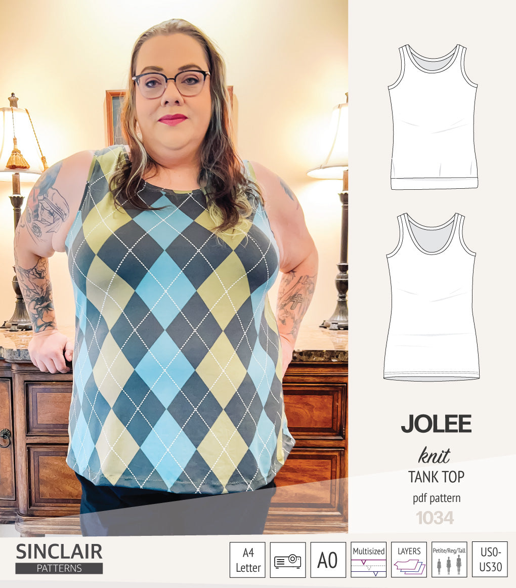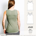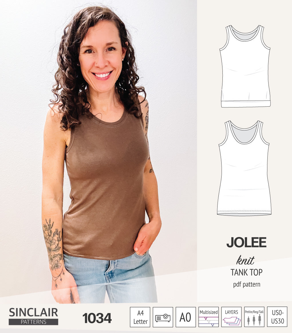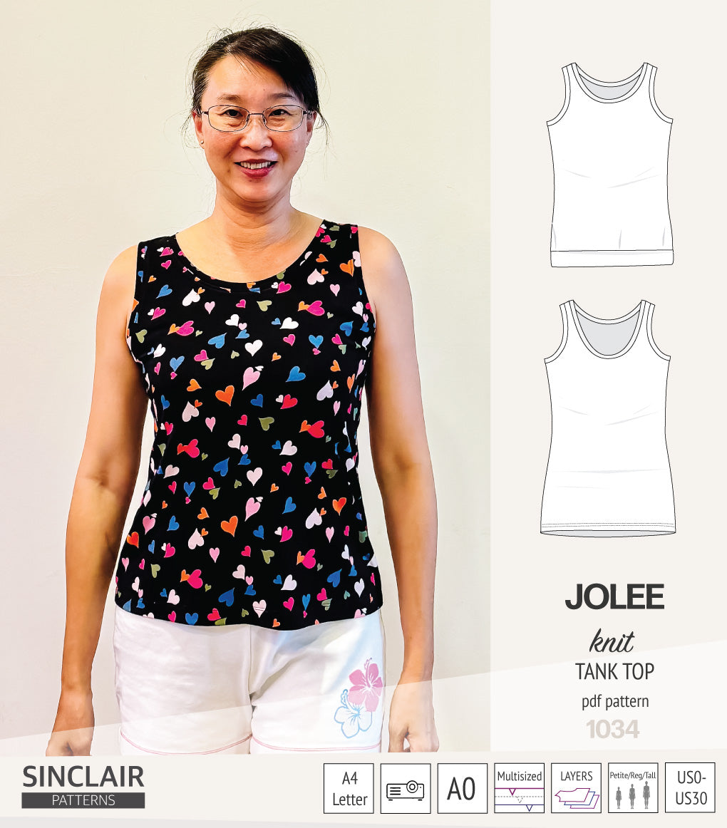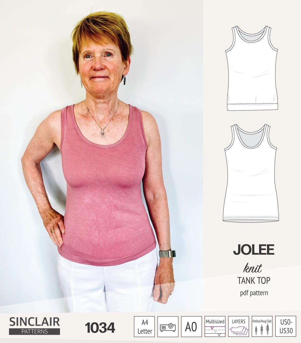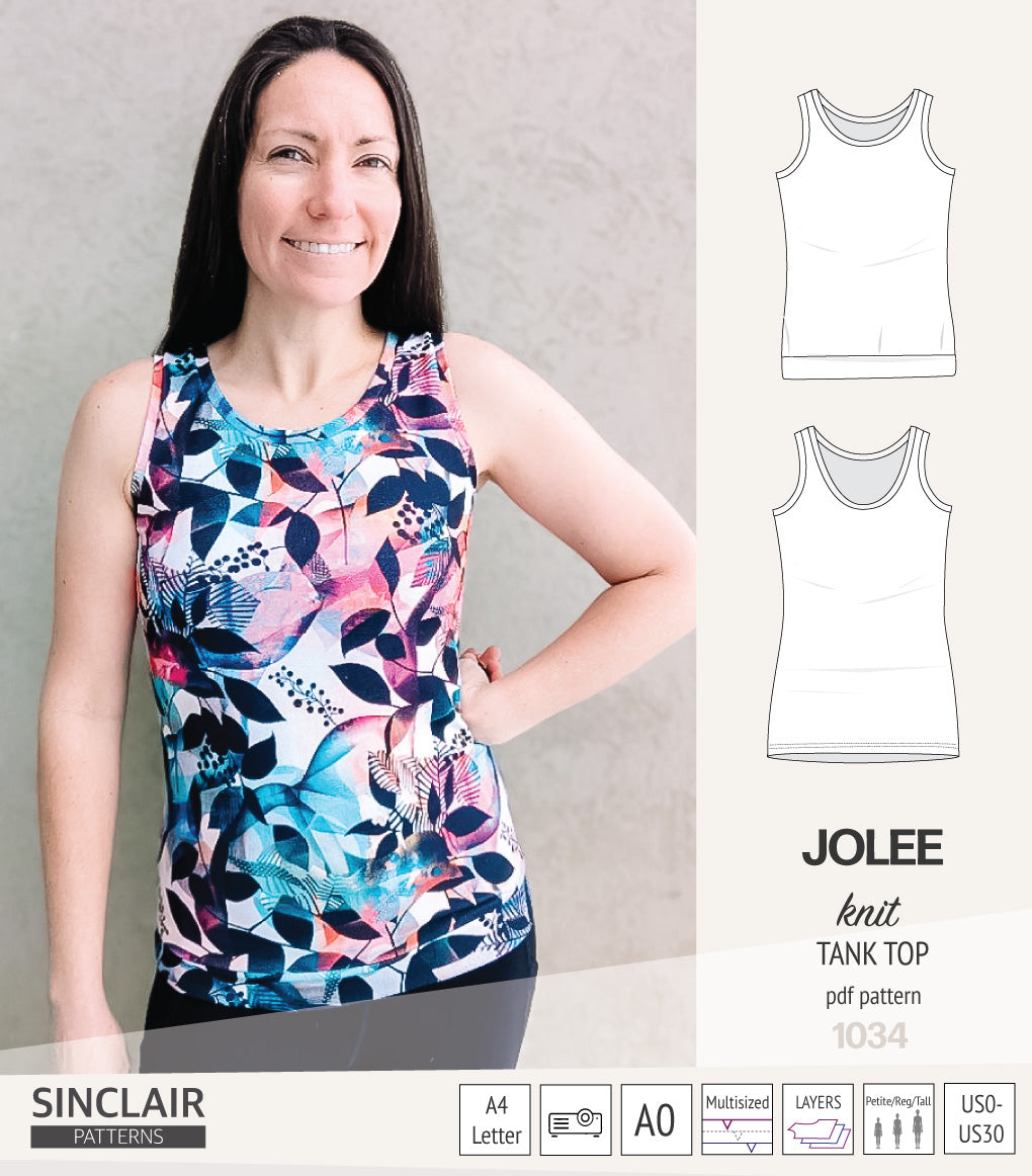 I have several tank top patterns, but there is something special about the Jolee. I have made 3 since I bought the pattern and I need more. The neckline depth is perfect, there is no gaping at the neckline or armhole and it covers the bra straps.